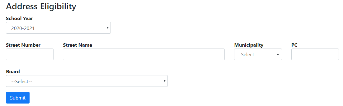The Address Eligibility Query will show the schools that fall within the same school boundaries as the queried address, given the selected district and grade. Clicking on the school name will direct you to the School Information page on BusPlanner Web. If a student is eligible for bussing, clicking on Bussed in the Eligibility column will bring up the transportation information to and from school for the queried address.