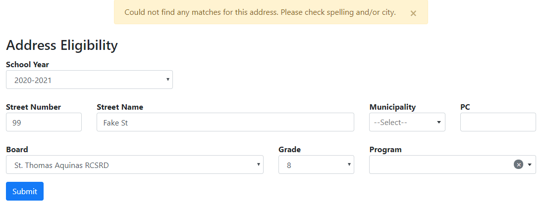 Once the parameters of the Address Eligibility search have been set, clicking the Submit button will retrieve the transportation eligibility information. If the combination of Street Number, Street Name, and City do not exist in BusPlanner Web, you will receive an error message, as shown below.